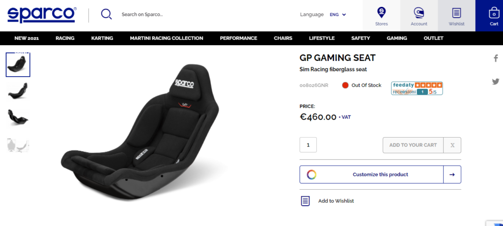Sparco GP Gaming Seat priced at 460 euros. It’s currently out of stock, but Joe Sullivan posted in the forums that the Sparco rep he talked to said their goal is to have them available in about two months.