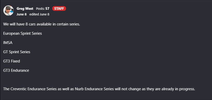 Greg West Posts in the forums that we will have 8 cars available in certain series. those are the European Sprint Series, IMSA, GT Sprint Series, the GT3 Fixed and the GT3 Endurance. The Creventic Endurance Series as well as Nurb Endurance Series will not change as they are already in progress.