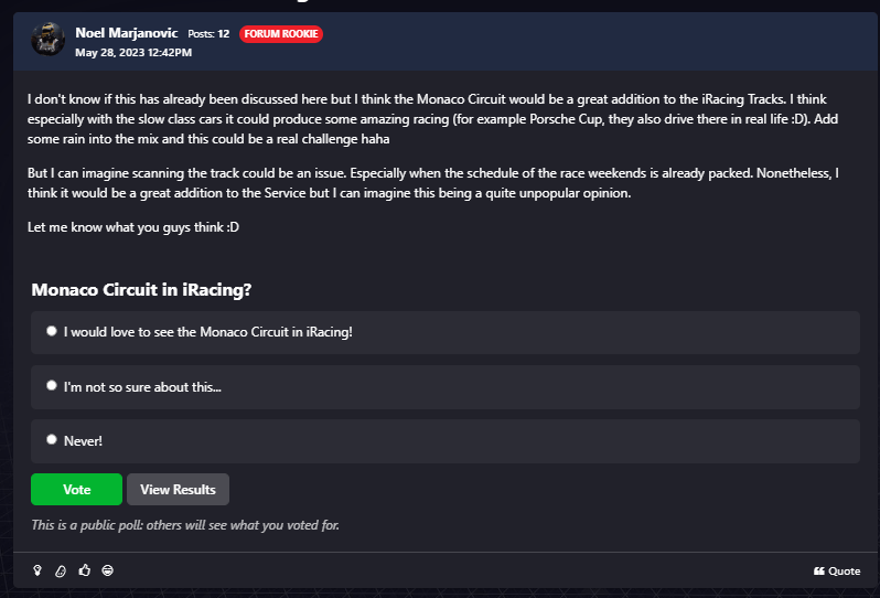 Noel Marjanovic polled the forums if Monaco should come to iRacing