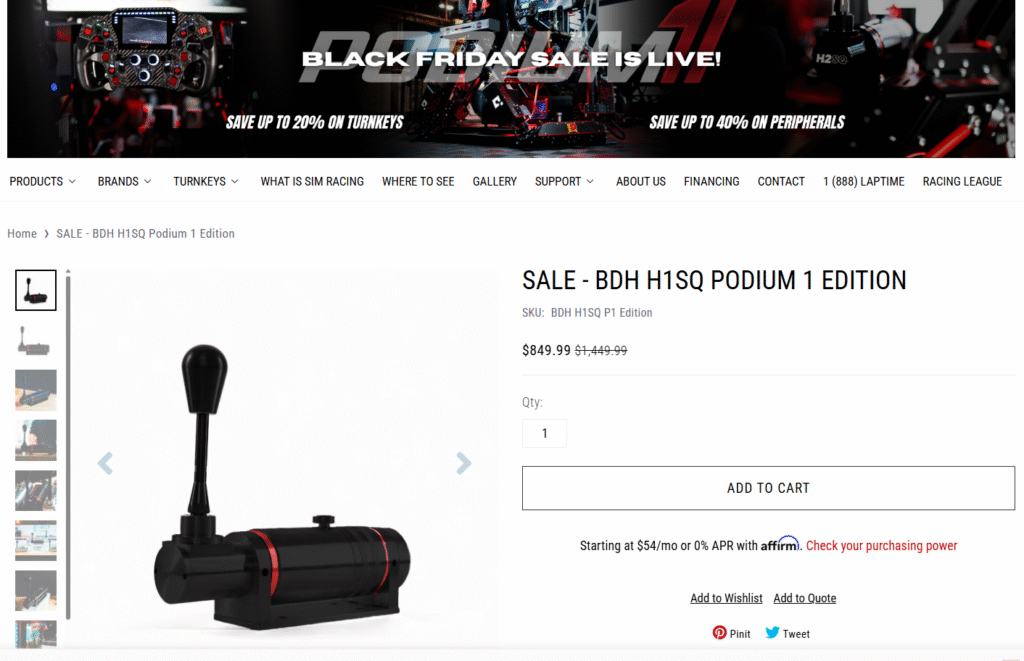 - Podium 1 (North America): Offers up to 20% off on turnkey setups and up to 40% off on peripherals (e.g., a BDH1SQ is listed for $850, down from $1,450) [03:19].