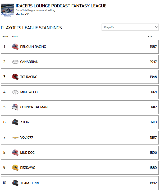 - Brad W – P last. Was wrecked twice in the first lap. Hoping a few drivers settle down or it’s going to be a long season. See comments from IMSA race about my feelings on this track.
