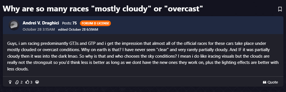 https://forums.iracing.com/discussion/87811/why-are-so-many-races-mostly-cloudy-or-overcast