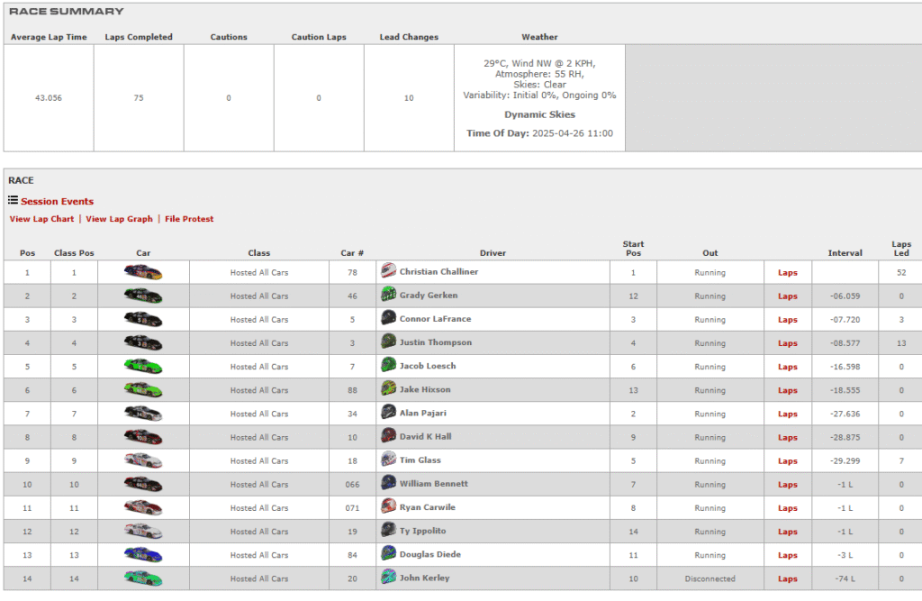 - Brad W – P8 in class p11 overall after starting p26. Not my best track and should have finished higher but killed the tires over the last 10 laps. Almost ran out of fuel because the white was delayed a lap. Did not have a good showing in Season 6 and looking to make up for it in the mini season 6.5 that will start in two weeks. A huge congrats to the Season 6 GRR GT3 Pro Champion, Mr. William Westbrook!