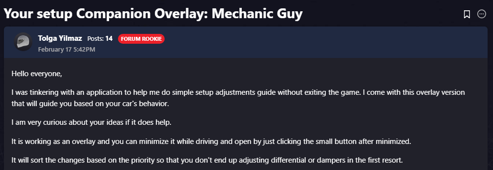 https://forums.iracing.com/discussion/92556/your-setup-companion-overlay-mechanic-guy