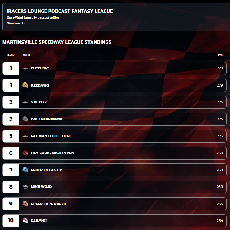 - Brad- P2 I tried to throw this one away also. Started p2 and spun the tires on the start. Managed to collect both teammates, Justin and Greg. From that on I was all about getting back to the front. We had way too many yellows but it’s Martinsville. I would finally get back to the top 5 with about 50 las to go and flip back and forth between P2/3 over the closing restarts. Managed to come out on the good side of the swing and grabbed a P2.